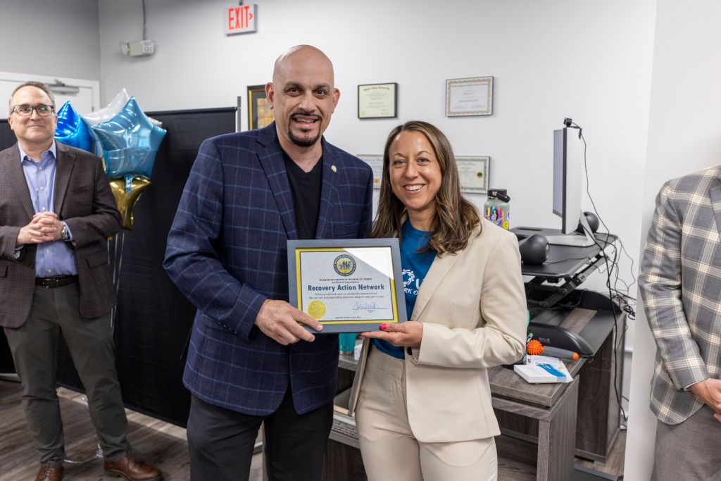 Mayor Rhaesa presents a certificate of recognition from the City of Wayne to Executive Director Allison Herrst in honor of the center’s opening.